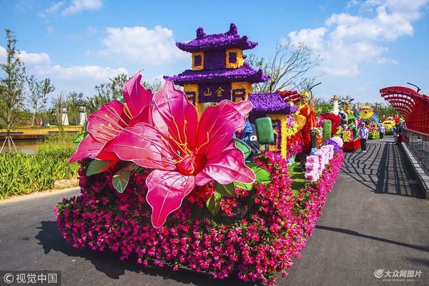 2018年10月5日,江蘇揚(yáng)州,6輛花車在揚(yáng)州儀征市棗林灣生態(tài)園內(nèi)新建博覽園博覽園為游客巡游。
