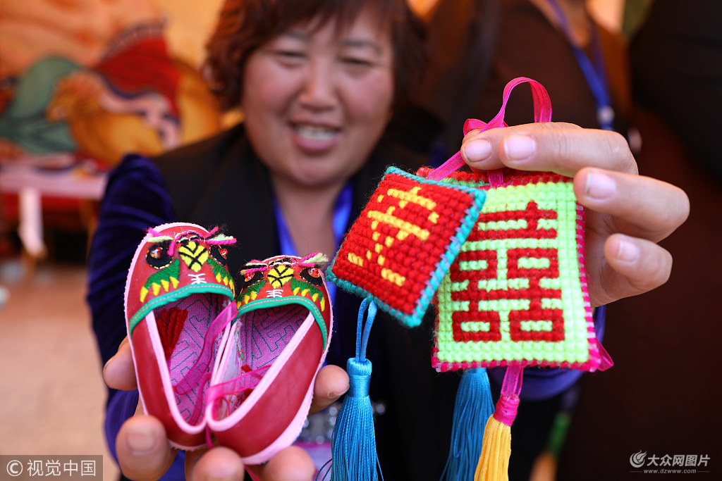 2018年10月20日,山東威海,在山東省榮成市“巾幗好產(chǎn)品”評選大賽暨巾幗民俗旅游產(chǎn)品展上,參展婦女在展示自己制作的手工藝品。