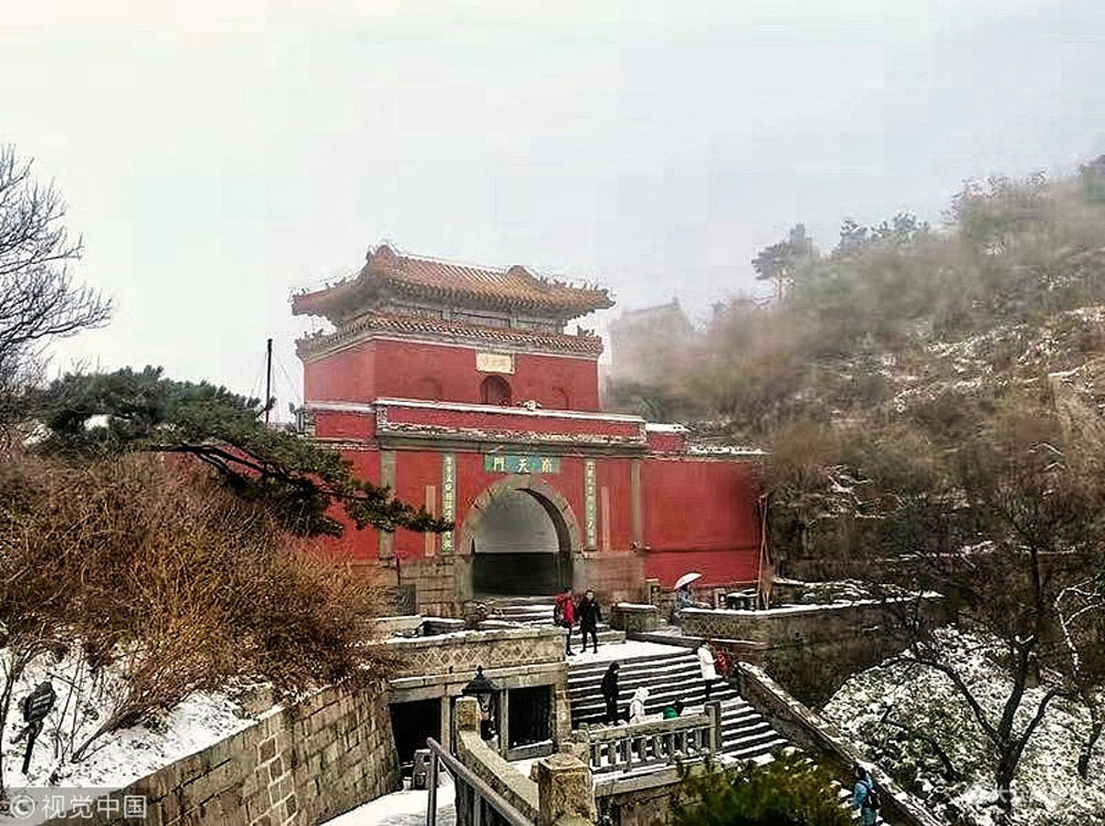 2018年11月7日,山東泰安,泰山景區迎來了入冬的第一場雪,清晨被雪覆蓋的南天門。