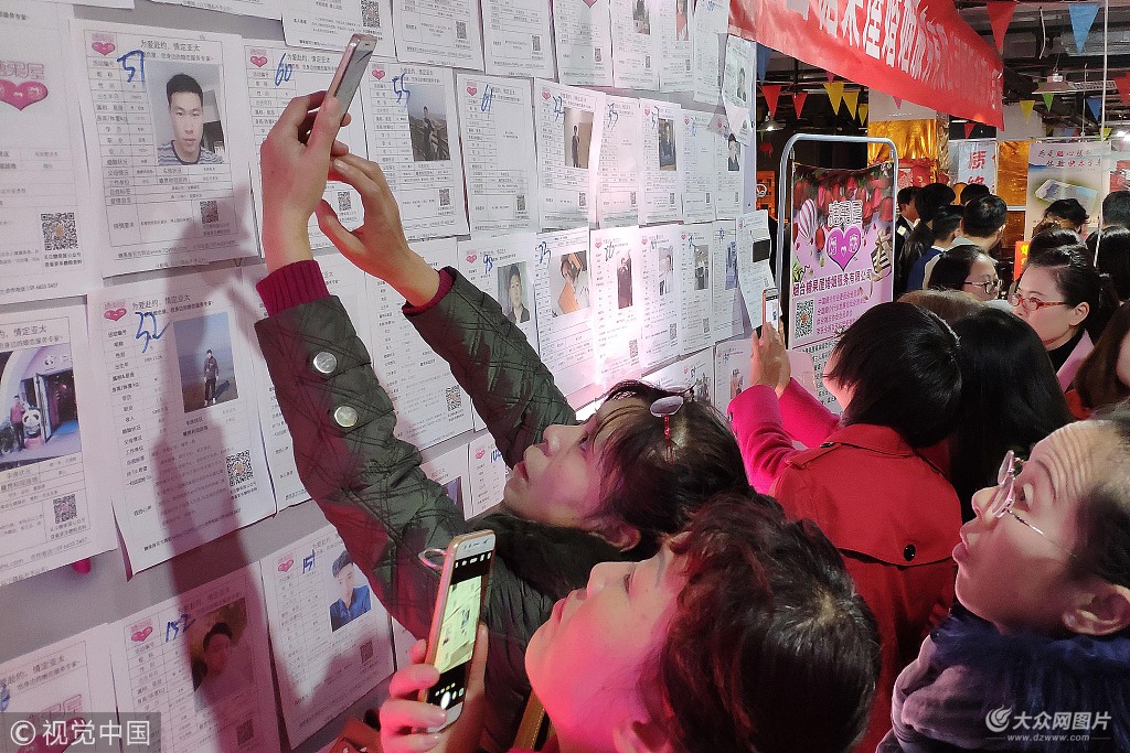 2018年11月11日,在山東煙臺亞太婚慶文化產業園,相親者在相親會資料墻上尋找相親對象。