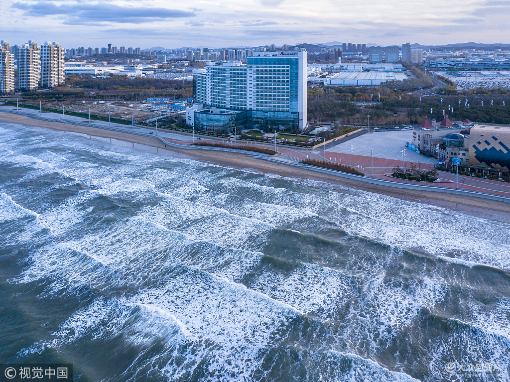2018年11月16日,山東煙臺,大風來襲,開發區金沙灘綿延千米的海岸線上,波浪層起。