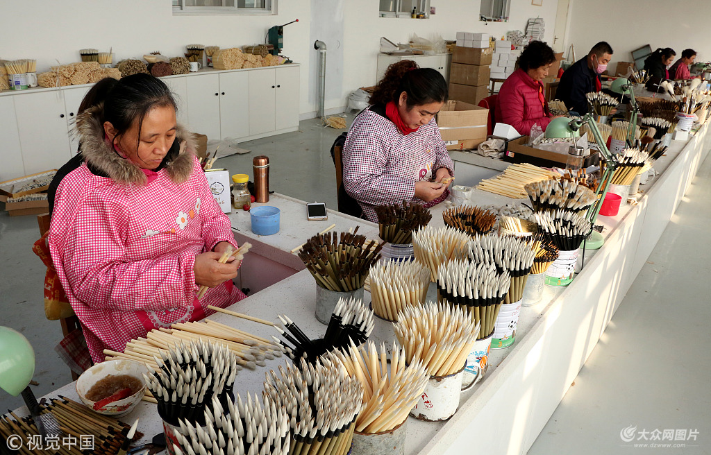 2018年11月24日,在山東省棗莊市陰平鎮,工匠們在手工制作毛筆。