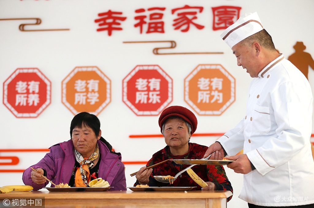 2018年11月27日,山東青島市即墨區(qū)靈山鎮(zhèn)的“助老大食堂”工作人員王顯忠(右一)為老人們加菜。