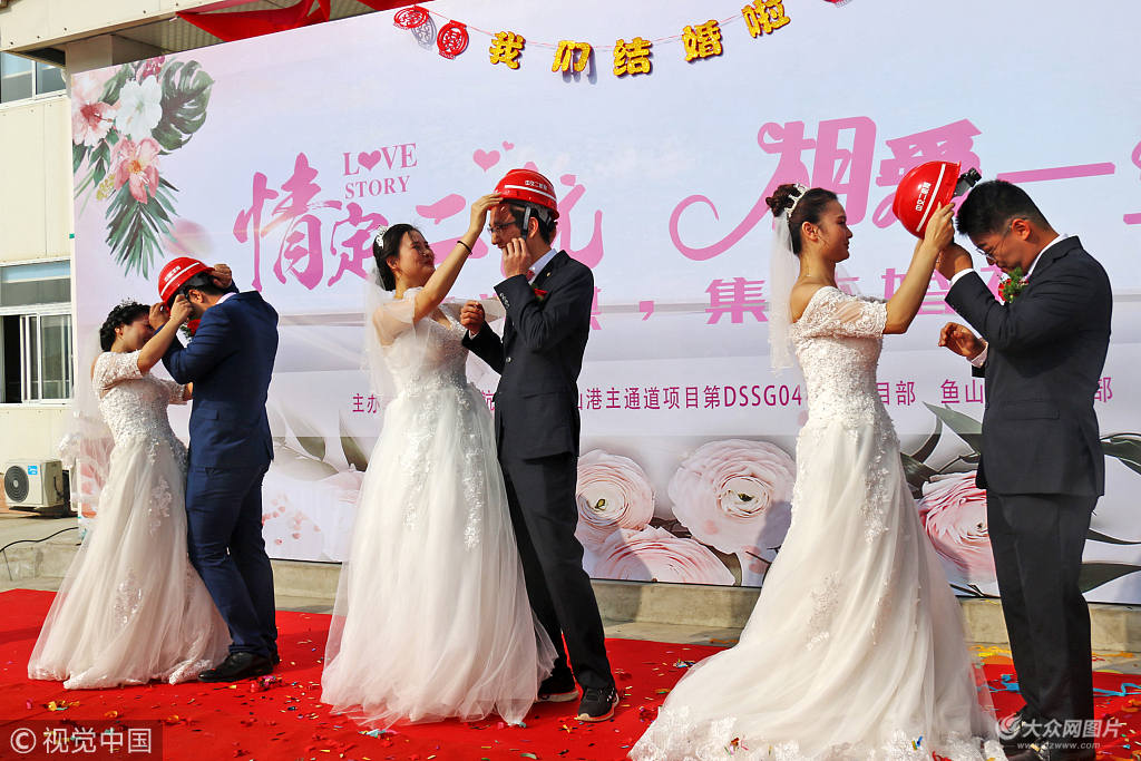 浙江舟山:大橋工地上舉行集體婚禮 新娘為新郎戴上安全帽