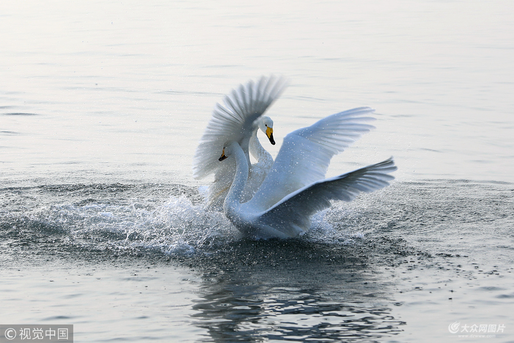2018年12月1日,在山東省榮成市櫻花湖,大天鵝在嬉戲打鬧。