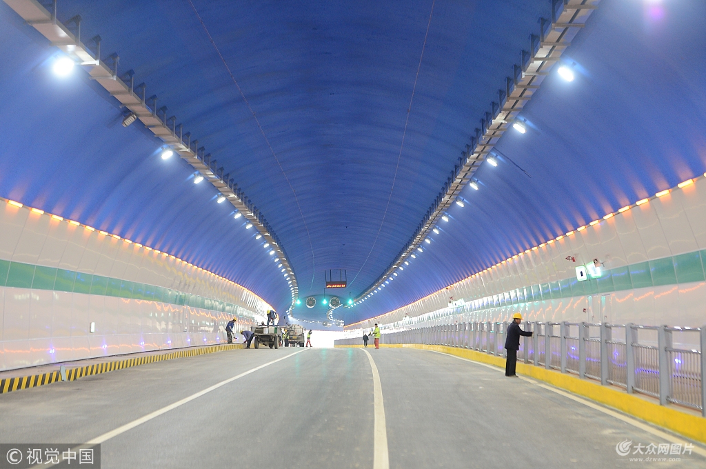 2018年12月4日,濟南,在鳳凰路南首的車腳山下,鳳凰路與二環(huán)南路快速路聯絡通道---鳳凰路隧道基本建成,隧道全長745米,設計為雙向六車道,兩隧道間距8.5米,每個洞口的三條車道寬約3.5米、3.5米以及3.75米。其中在雙向隧道的最右側為行人和非機動車輛慢行一體車道,通過1.2米高的護欄與快車道進行隔離。隧道內部頂層全部噴涂有天藍色涂料,兩側為白綠相間防火裝飾板,數千盞照明燈和LED裝飾將隧道照亮,堪比海底隧道。
