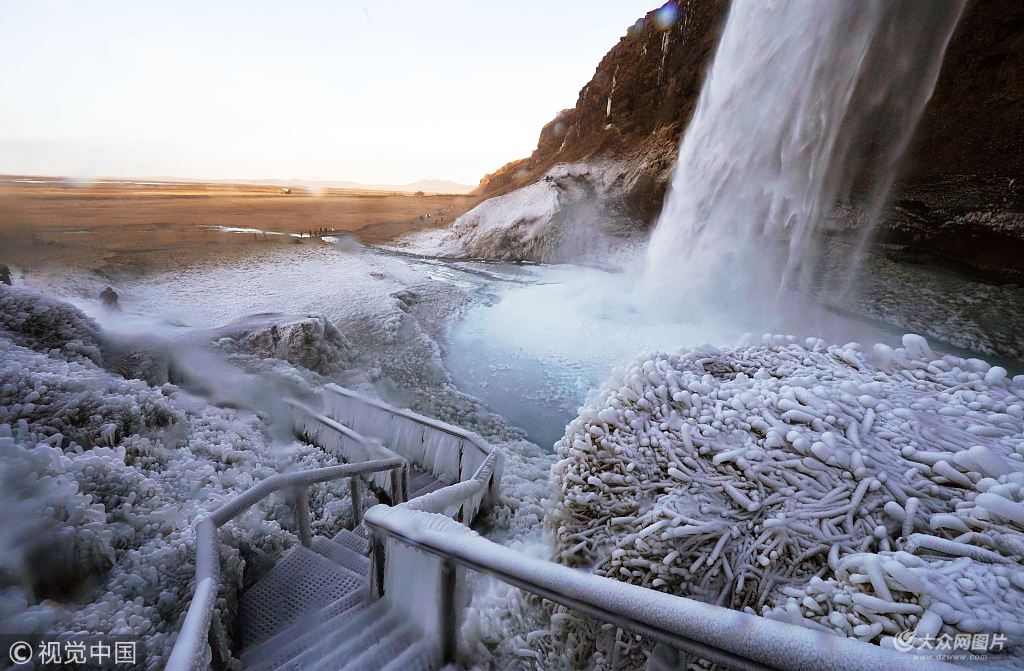 當地時間2018年12月3日,冰島塞里雅蘭瀑布在零下12攝氏度的氣溫下結冰。