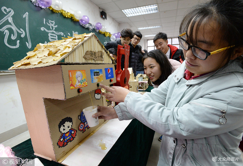 2018年12月11日,河北邯鄲,一名大學(xué)生展示利用廢舊紙箱和一次性筷子等物品制作的飲料機(jī)。