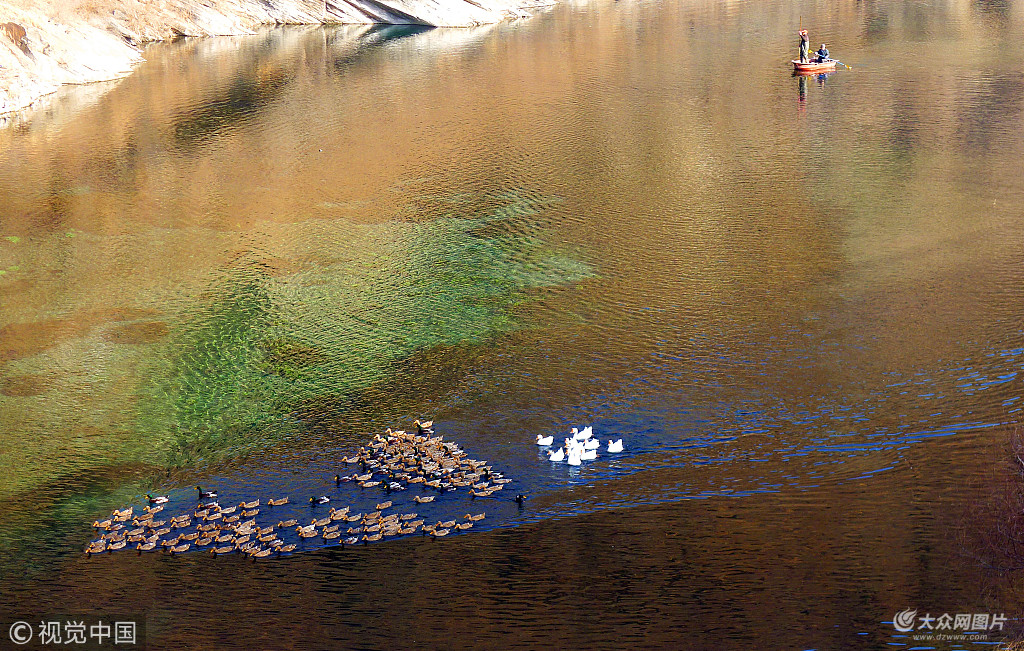 北京房山,大石河黑龍關(guān)有段幾百米長的河道,至今未被封凍,河水碧水蕩漾、波光粼粼,成群的鴨、鵝在水中覓食、嬉戲,“演奏”著歡樂的大合唱。在這個被四周群山包圍的河道里野趣橫生的風景,良好的生態(tài)環(huán)境吸引市民前來休閑找樂。