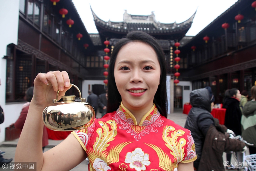 一名姑娘在蘇州山塘古街展示傳統冬至取暖用品湯婆子