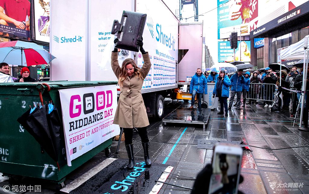 當地時間2018年12月28日,美國紐約,新年前夕,時報廣場舉辦一年一度的“大解脫日”活動,公眾將2018年中不快樂的回憶寫在紙上扔進粉碎機中,并將載有不快樂記憶的物件砸壞,從而告別過去的一年,迎接新的一年。