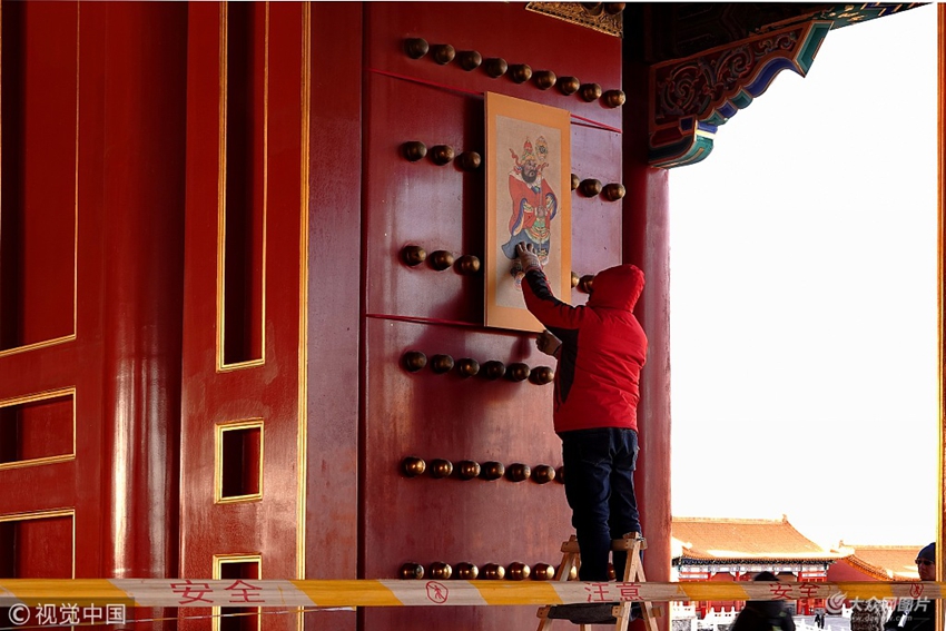 2018年12月29日,北京。故宮掛起宮燈貼上年畫,喜氣洋洋過新年