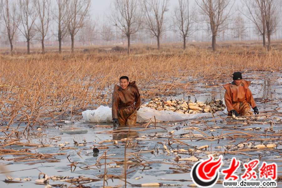 大眾網(wǎng)濱州·海報(bào)新聞1月4日訊(記者 張爽 趙越) 俗話說:“吃藕不忘挖藕人!鄙徟汉贸缘烧饋韰s辛苦異常。每到歲末年初氣溫驟降之際,水塘里已結(jié)了一層厚冰,挖藕人也迎來了他們最忙碌的日子。一身皮衣,在1米多深的冰水中摸索出埋在淤泥中的蓮藕,一天工作7個多小時,收入三四百元,上岸時早已凍得透心涼。常年累月在冰水中作業(yè),使他們多數(shù)患有老寒腿,即便如此,好的收成足以慰藉整個寒冬的辛勞。