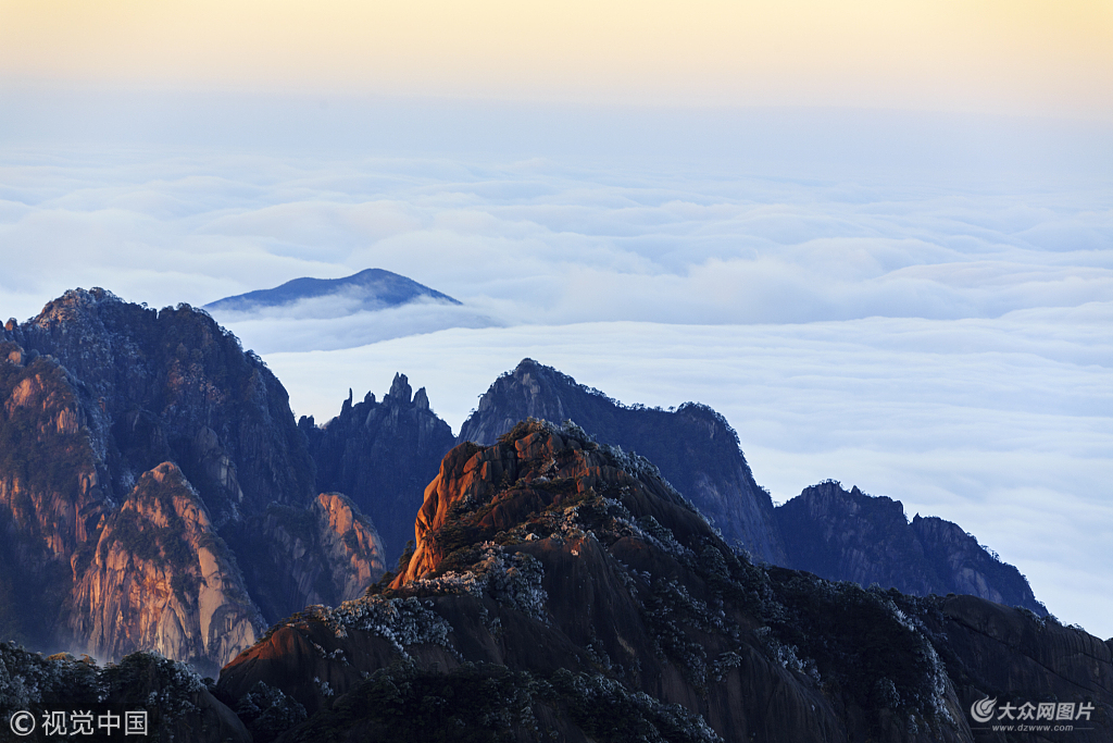 2019年1月12日,日出、云海、霧淞在安徽黃山之巔輪番上演。當天早上,海拔1300米至1500米之間的黃山境內云霧繚繞、云海翻騰,云在零攝氏度下凝華成水蒸氣隨風聚積在松樹上,雪白的一層,似雪非雪,似霜非霜。晶瑩剔透的霧淞與翻滾的云海、絢麗的日出相映成輝,把游客帶入如詩如畫的幻境之中。