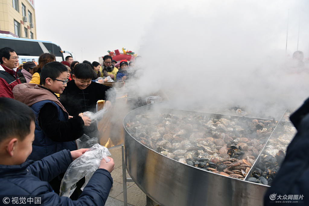 山東威海:3米大鐵鍋蒸600斤牡蠣 近千人共享免費海鮮大餐