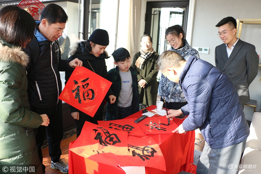 2019年1月20日,在山東省鄒城市大束鎮云夢桃源小鎮,書法愛好者為小鎮居民寫春聯送福字。