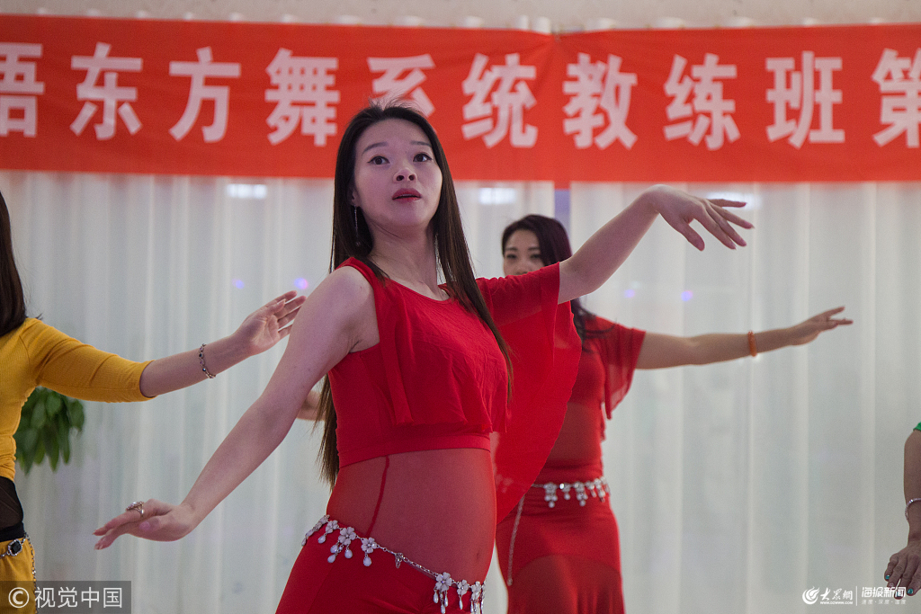 2019年1月22日,山東棗莊,33歲的棗莊女子林語在懷孕6個多月時每天仍堅持登臺演出訓練,其中包括表演舞蹈中的“身體的大波浪”等高難度動作。