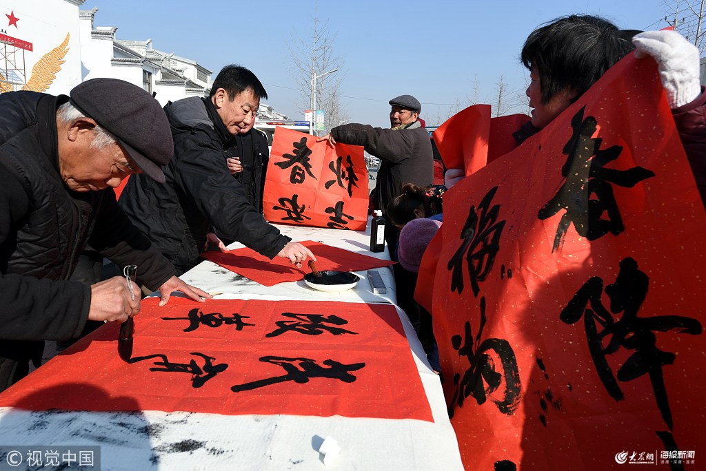2019年1月23日,在山東省臨沂市郯城縣馬頭鎮馬東社區,書書法家們在義務為居民書寫春聯。