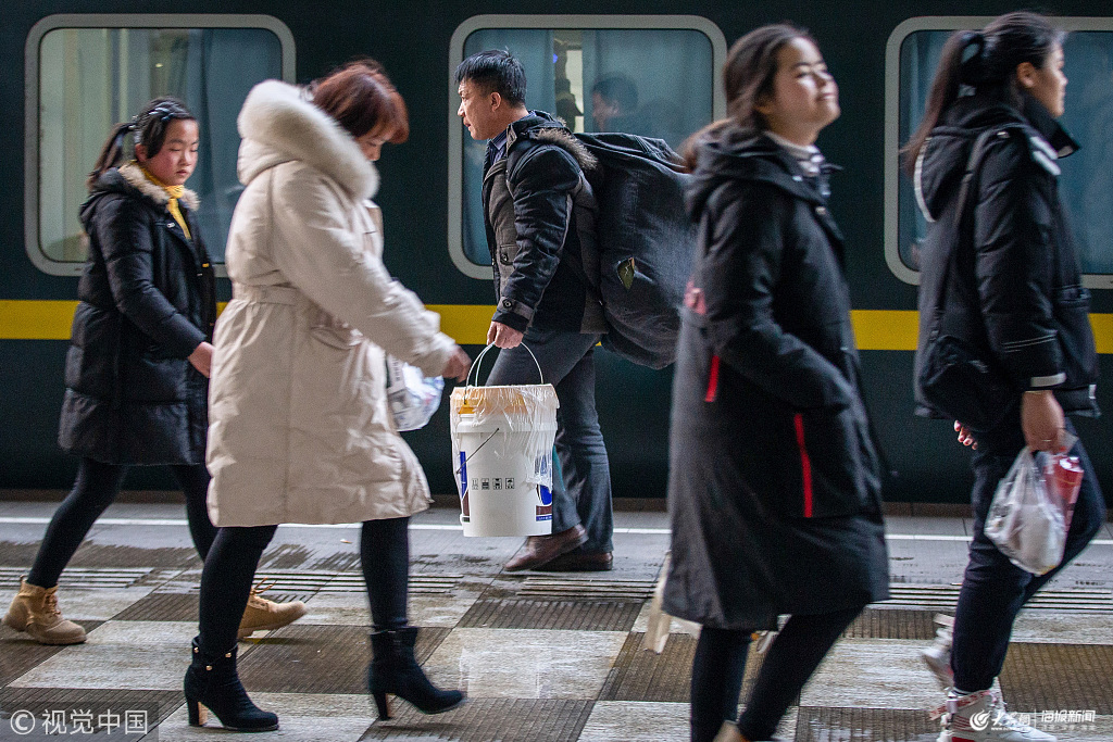 2019年1月24日,旅客手提涂料桶在南京火車站準備乘車。