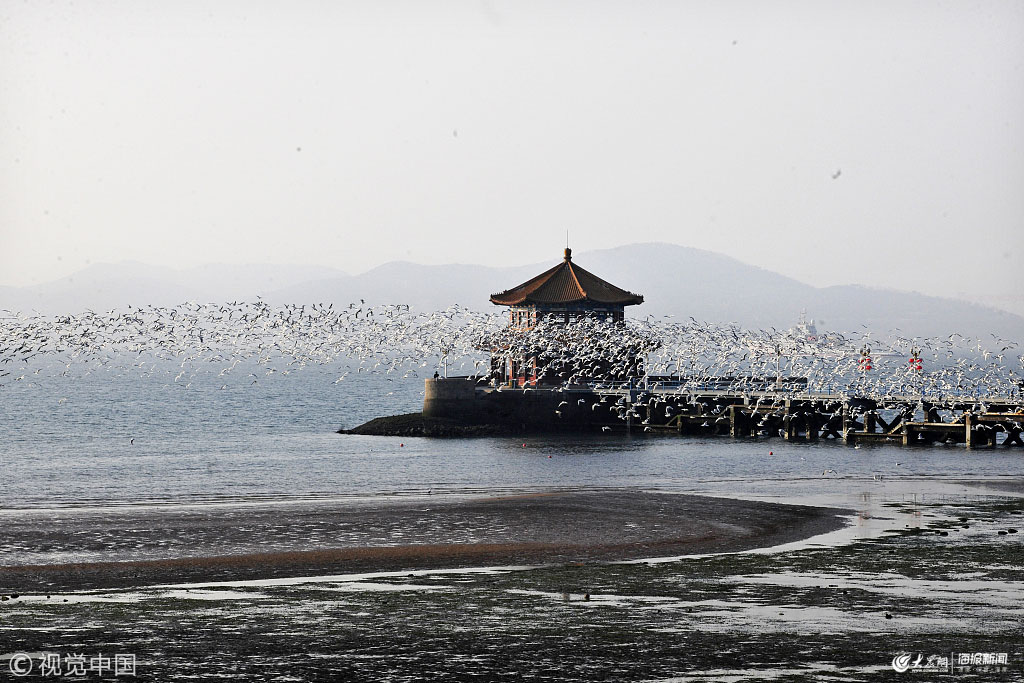2019年2月1日,青島前海棧橋海域出現大批海鷗集群飛行盤旋,在青島標志性歷史建筑回瀾閣周圍,形成宏大的鳥浪景觀。
