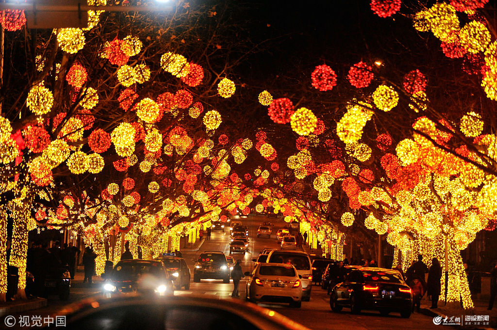 2019年2月5日,山東青島西海岸新區(qū),黃浦江路道邊樹上掛滿點(diǎn)亮的花燈。