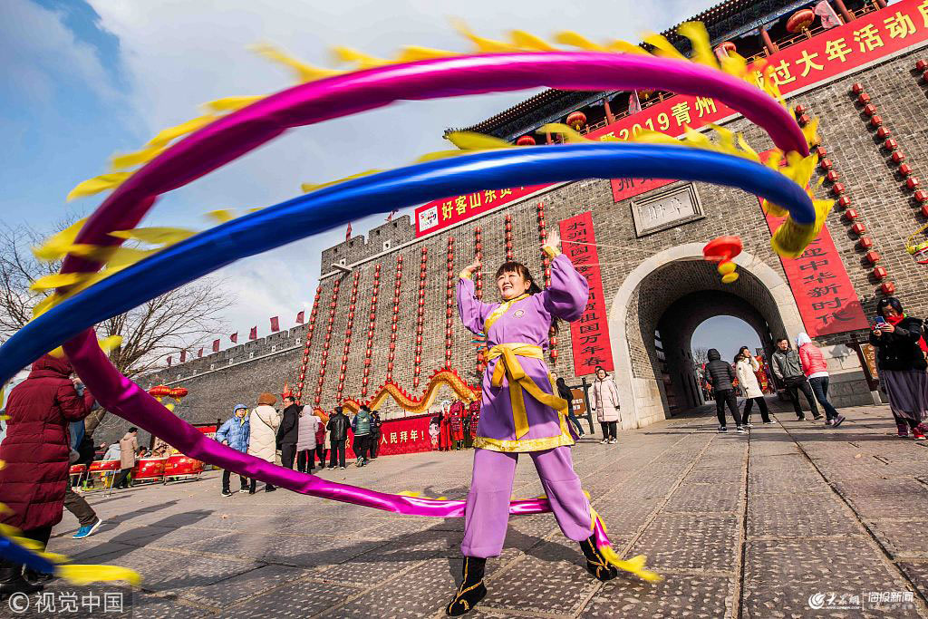 2019年2月7日,大年初三,在山東省濰坊市青州古城景區的廟會上,各類民間藝人施展技藝,吸引眾多市民前來觀光游玩,感受濃濃年味。