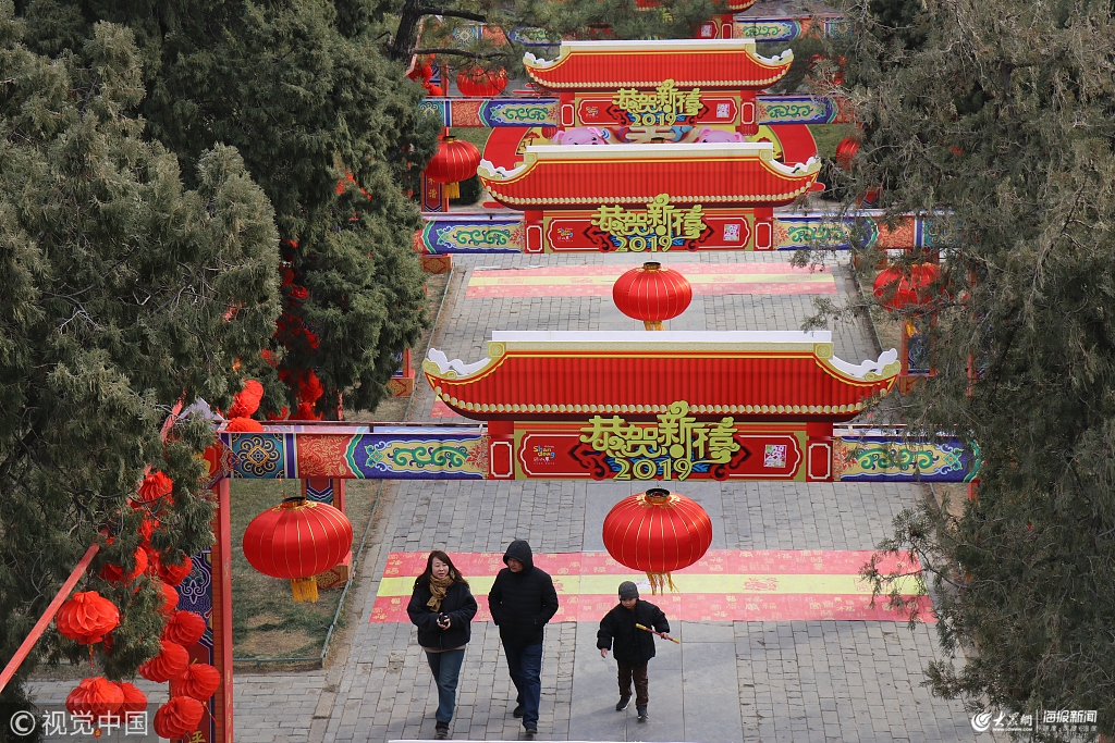 2019年2月9日,山東泰安。迎新年,逛岱廟是當地市民傳統習俗。春節期間,岱廟景區處處張燈結彩,人潮如織,洋溢著濃濃的節日氣氛。