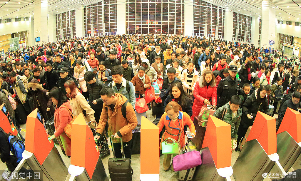 2019年2月10日,湖南衡陽,乘坐由衡陽開往深圳的G6035次旅客在高鐵衡陽東站進站上車。圖片作者:曹正平/視覺中國