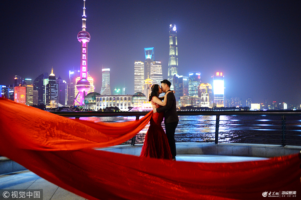 2017年12月17日,上海,夜幕下,一對熱戀青年在寒風(fēng)中拍攝婚紗照。