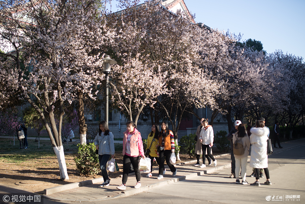 2019年3月23日,位于濟南的山東師范大學校園內(nèi),季葉李、美人梅等植物盛開,將校園的馬路裝扮一新,學生上課如通穿越畫中。