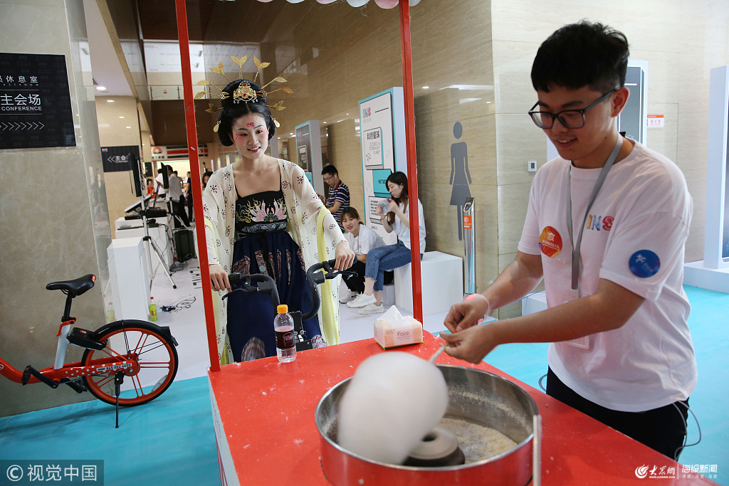 2018年5月22日,2018全球INS大會(huì)登陸西安,唐朝妹妹踩著共享單車發(fā)電,小伙用竹簽卷著,不一會(huì)就做出一個(gè)棉花糖。