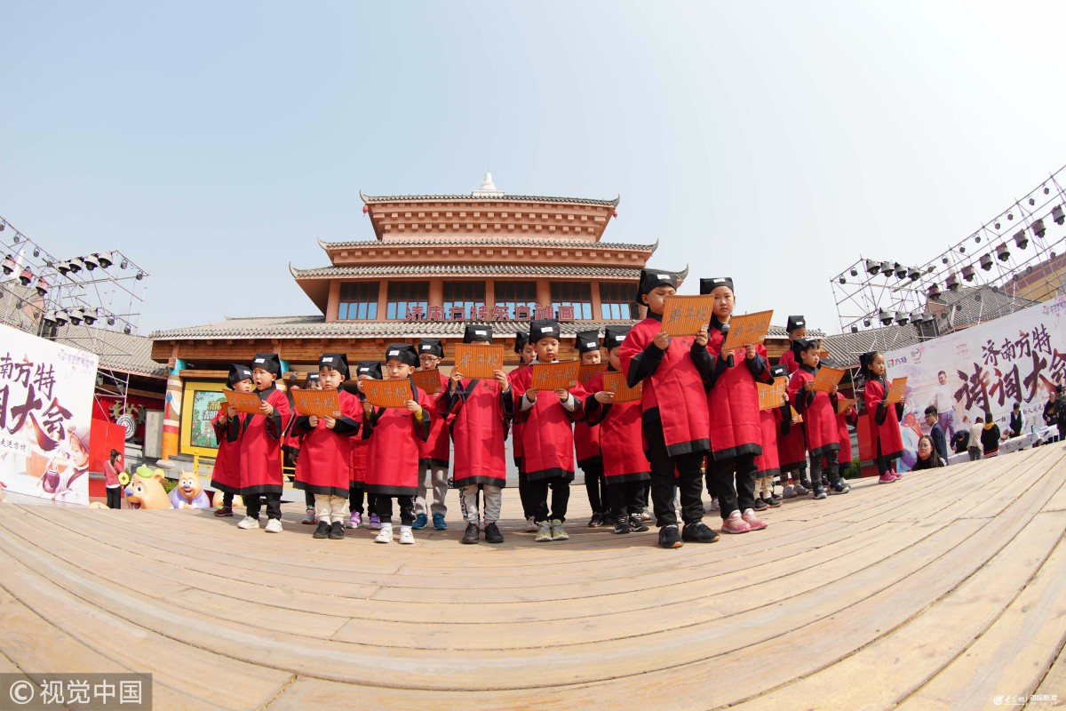 2019年4月5日,傳統清明時節。濟南市方特東方神畫景區內舉辦的“方特詩詞大會”,開筆破蒙,傳承文化。幾十名“書童”齊聚,學習孔子傳統禮儀、誦讀《弟子規》經典國學文章;身著漢服美女登臺鶯歌燕舞,書畫家現場寫詩作畫,玩轉詩詞,吟誦清明。通過此種形式致敬中華美德、傳承中華優秀傳統文化,令人游客賞心悅目,在游園中體會中華傳統文化的博大精深。