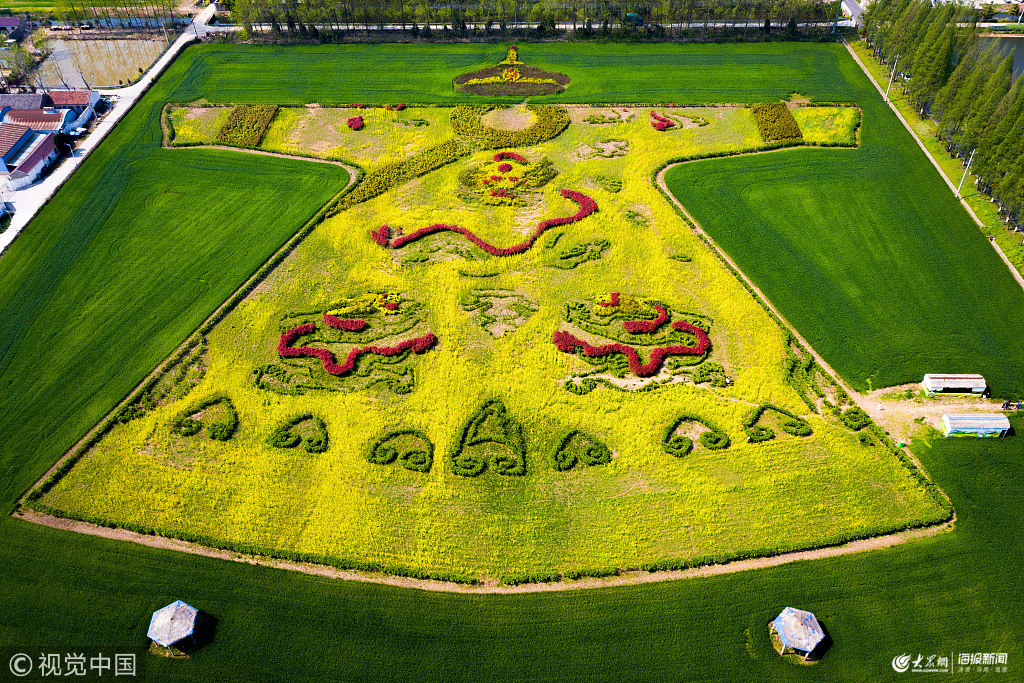 2019年4月6日,南京,又到油菜花開的時節(jié),在六合區(qū)龍袍街道長江漁村,人們在田野里用油菜花耕種出一個大型“龍袍”圖案景觀,從空中俯瞰,猶如“皇帝的新裝”,頗為壯觀。