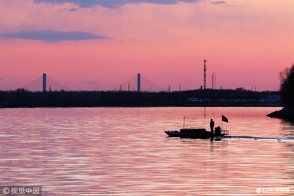2019年4月8日,黑龍江省哈爾濱市,松花江上,晚霞艷麗,江畔,市民在用五六米的大網(wǎng)“搬魚”,還有人在撒旋網(wǎng)捕魚。