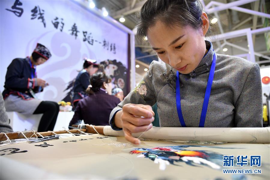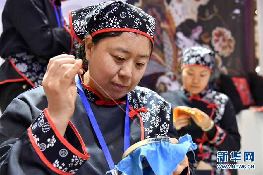 4月19日,在濰坊市魯臺會展中心,民間藝人在展示刺繡技藝。