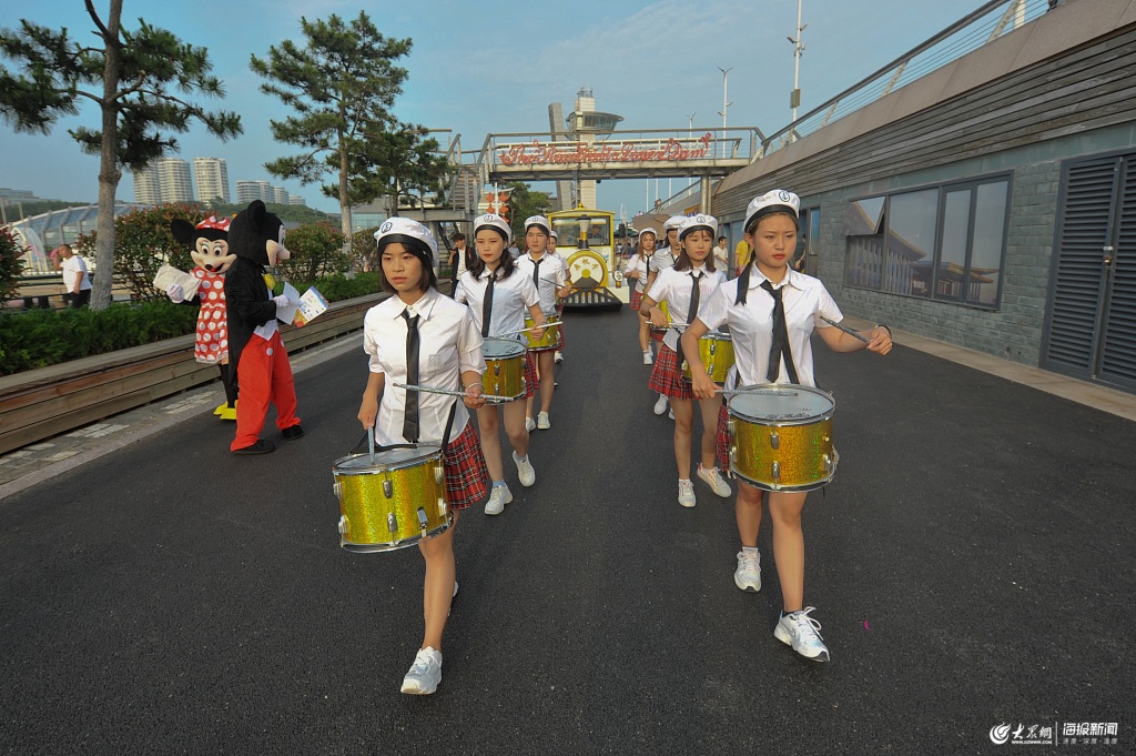 2019年6月29日,青島市奧帆情人壩休閑風(fēng)情街開街儀式上,軍鼓隊進行巡游走秀活動。