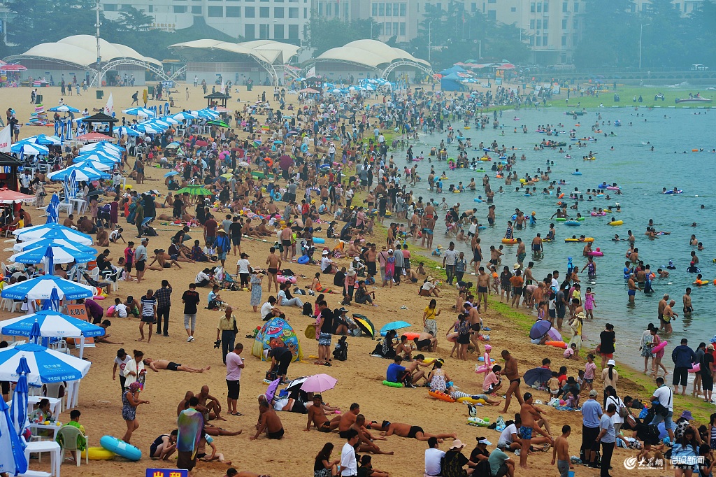 2019年7月12日,青島,游客在第一海水浴場洗海澡。當日是農歷六月初十,入伏日,青島第一海水浴場人山人海,大批市民游客前來洗海澡戲水消暑,享受大海清涼。