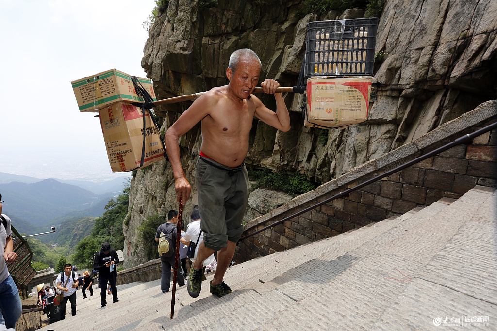 肩上搭一根光溜溜的扁擔(dān),扁擔(dān)兩頭的繩子掛著百余斤的貨物。烈日驕陽下,挑山工裸露的肌膚曬得黑紅,一甩胳膊,一抬腳,一串串汗珠落在地上。炎炎夏日,泰山挑山工并沒有減重,一天兩三趟來回,一趟百十斤重物,或是雞蛋、蔬菜,或是成箱的水和飲料,只要岱頂商戶一聲吆喝,挑山工們挑起一擔(dān)貨物就上了山,一個個樸實的身影增添了奮斗的光輝。