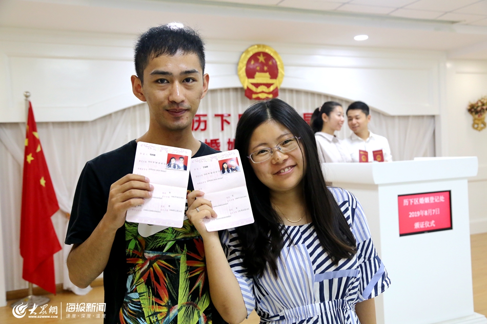 大眾網·海報新聞濟南8月7日訊(記者 儀首歌 李金珊 實習生 葛曉月)七夕是中國一年一度的傳統情人節。一大早,記者來到位于二環東路的歷下區婚姻登記處。雖然下著小雨,但仍然擋不住一對對情侶結發為夫妻的決心,早上8點,歷下區婚姻登記處的門口就排起了長隊,都想在這個美好的日子里,拿到幸福的號碼牌。婚姻登記大廳熙熙攘攘,每對情侶的臉上都洋溢著幸福的笑,已經拿到結婚證的夫妻,周圍仿佛都冒著粉紅色的幸福泡泡。