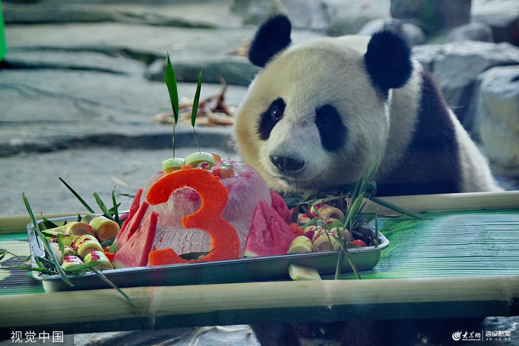 2019年8月17日,來武漢生活近一月的“胖妞”迎來了3周歲的生日,武漢動物園大熊貓館科普展廳舉辦了一場特殊的生日party,“奶爸奶媽”特制了一個雙層冰鎮水果“蛋糕”送進“胖妞”的房間,“胖妞”不愛蛋糕偏愛筍現場賣萌引圍觀。圖片作者:景觀/視覺中國
