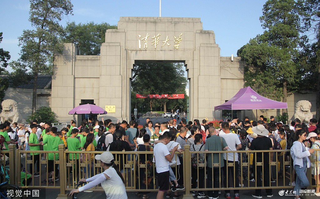 2019年8月18日,北京。因正值暑期參觀者眾多,清華大學西門外聚集了大量游客。參觀者紛紛在清華大學西門外駐足、拍照。