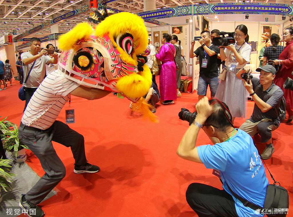 2019年8月23日,山東煙臺,在2019中國民間工藝品博覽會上,民間藝術家李榮仔在展示遂溪醒獅。