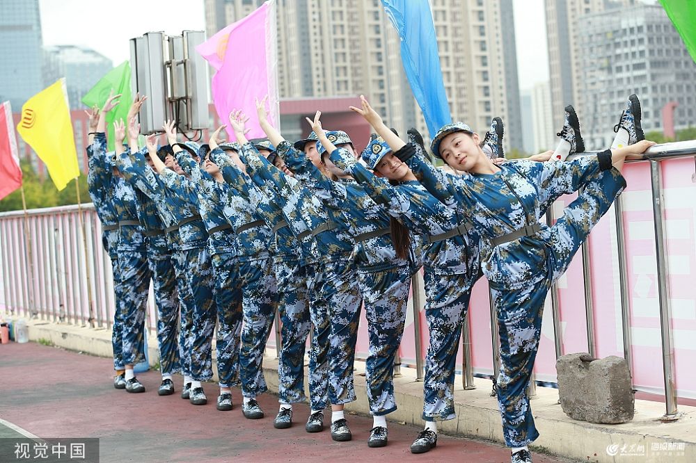 2019年9月17日,山東日照,曲阜師范大學(日照校區)內,2019新生的軍訓正在進行,這批00后的舞蹈系女生在軍訓間隙表演了“一字馬”等節目,顯出專業的功底。