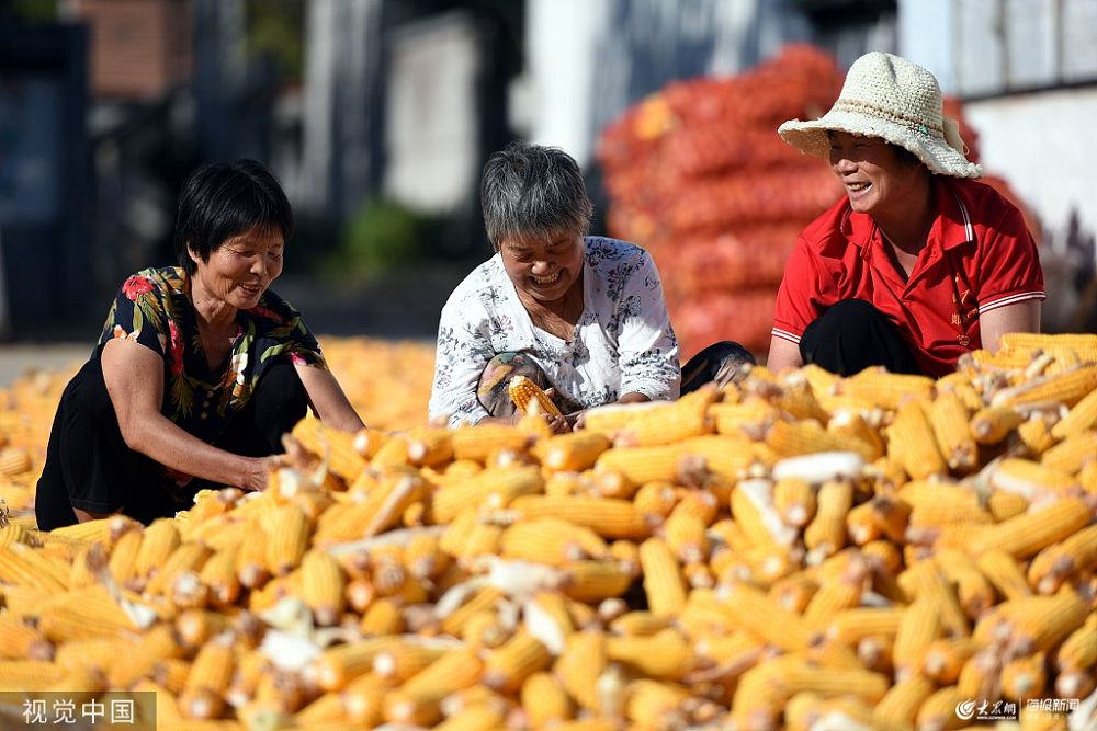 2019年9月18日,山東臨沂,金秋時節,被譽為“魯南糧倉”的郯城縣春玉米喜獲豐收,農民利用晴好天氣抓緊搶收晾曬。