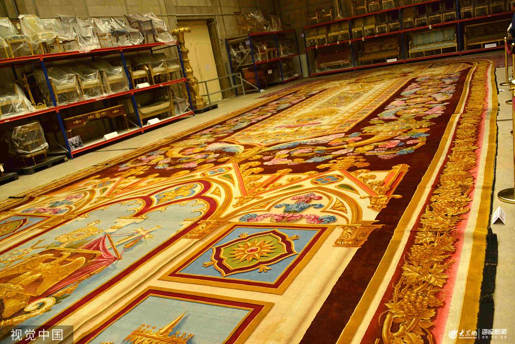 當地時間2019年9月21日,法國巴黎,在法國文化部展出的巴黎圣母院頂級文物、長達25米的“唱詩班地毯”。9月21日和22日是歐洲文化遺產日,巴黎圣母院大火后幸存的頂級文物這兩天在巴黎多個機構正式展出,參觀者絡繹不絕。這些頂級文物雖然找到了臨時安置之所,但對它們的考驗尚未停止。下階段如何進行保護和安置,社會各界莫衷一是。