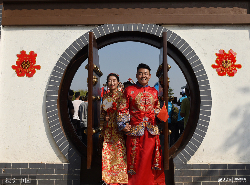 青島,一對新人從少海濕地公園的團圓門跨過。
