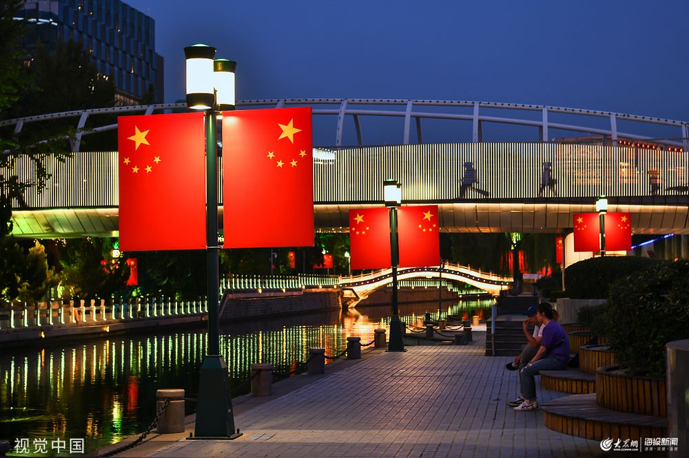 2019年9月29日,濟南多處道路掛起了鮮艷的五星紅旗,街頭節日氣氛濃。