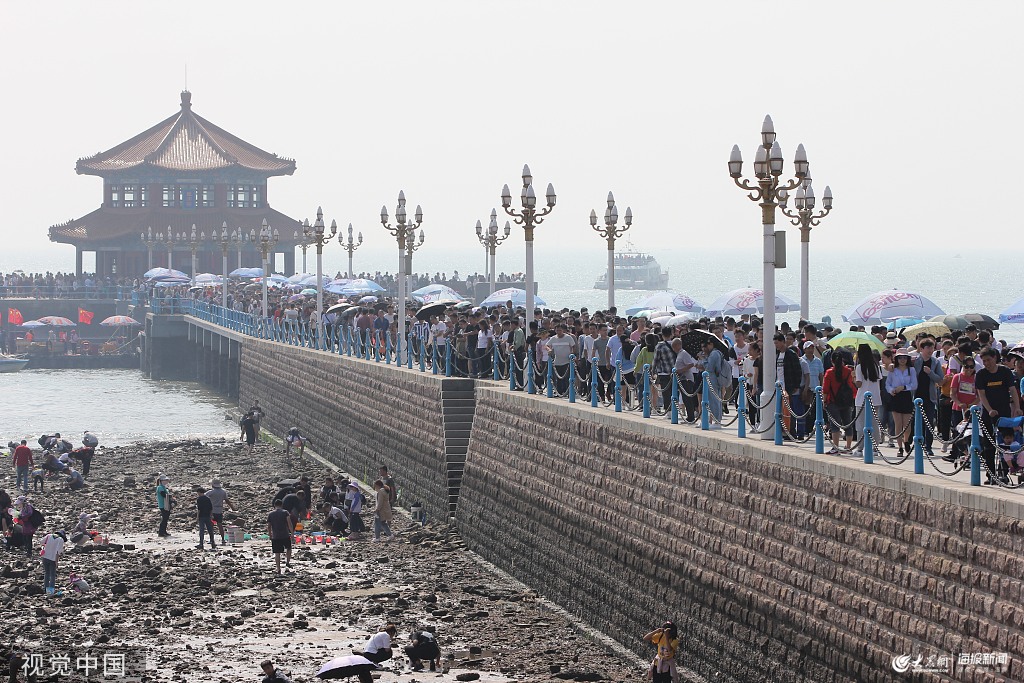 2019年10月1日,青島棧橋景區游人如織。當日是國慶長假第一天,青島棧橋風景區迎客流高峰,棧橋橋上及兩側海灘擠滿游人。