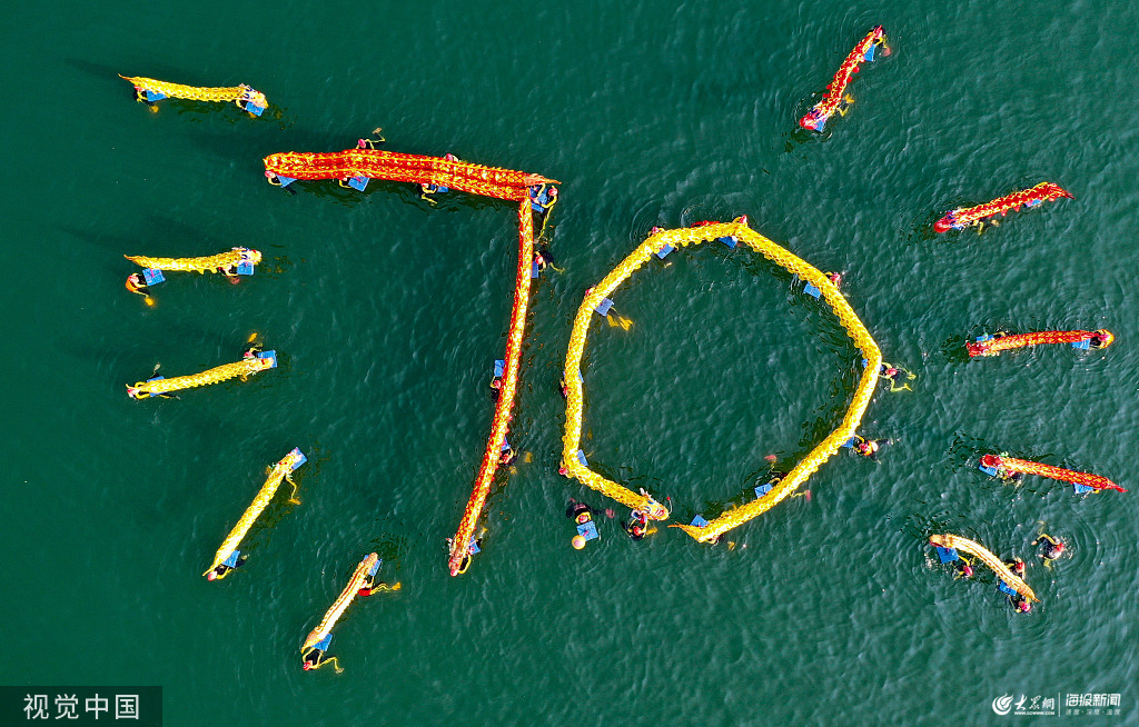 2019年10月2日,廣西柳州,游泳愛(ài)好者舉著彩龍?jiān)诹蠑[出“70”的造型。圖片作者:黎寒池/視覺(jué)中國(guó)