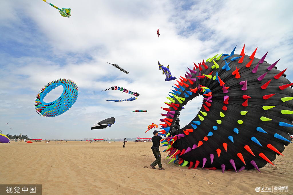 廈門,“大洲杯”2019亞洲運動風箏錦標賽暨廈門國際風箏節在觀音山夢幻黃金海岸沙灘舉行,選手們在放飛風箏。